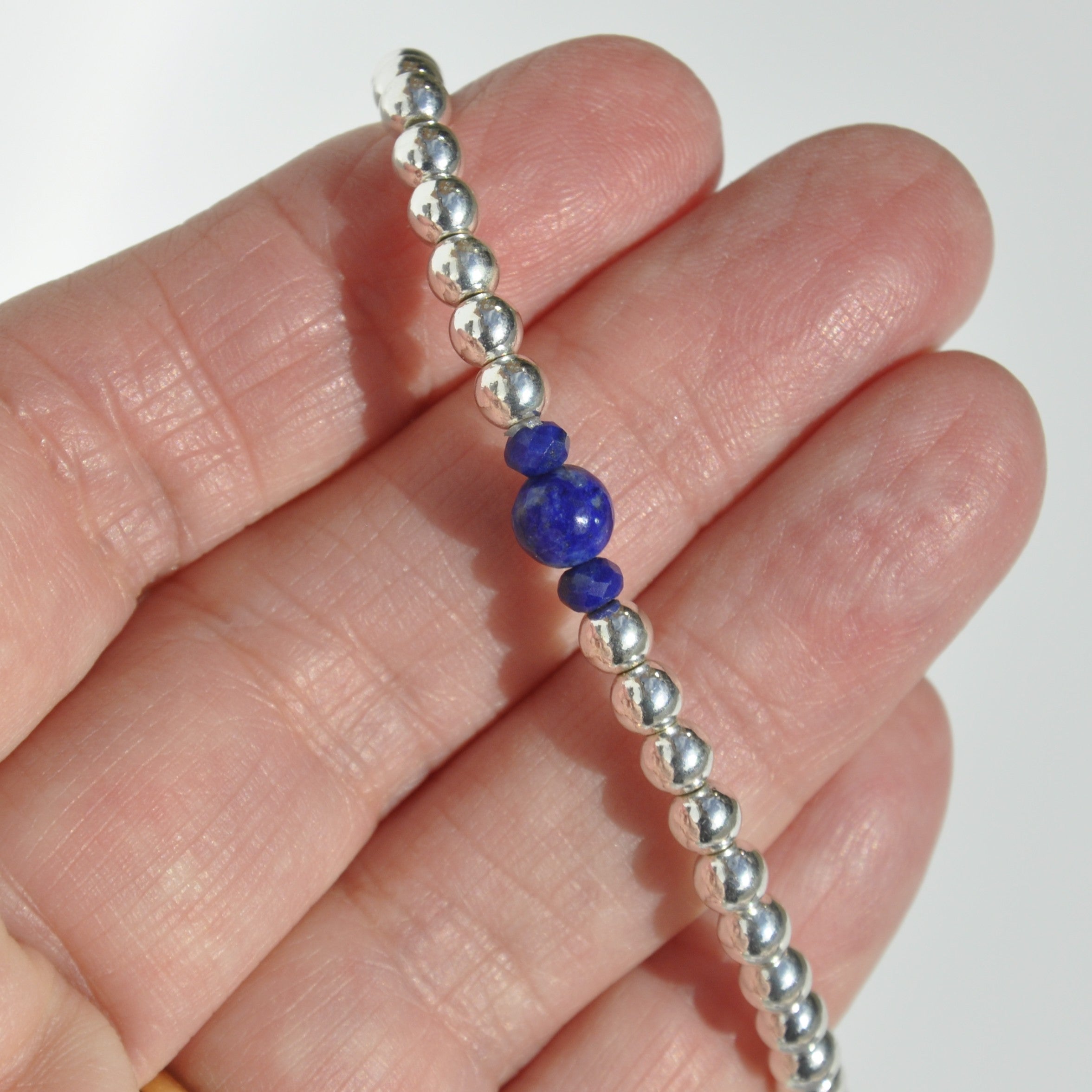 Lapis Lazuli is the birthstone for September birthdays, and this sterling silver-plated dainty bead bracelet makes a perfect birthday gift. It features gorgeous Lapis Lazuli crystal beads at its centre - one large and two smaller ones either side.