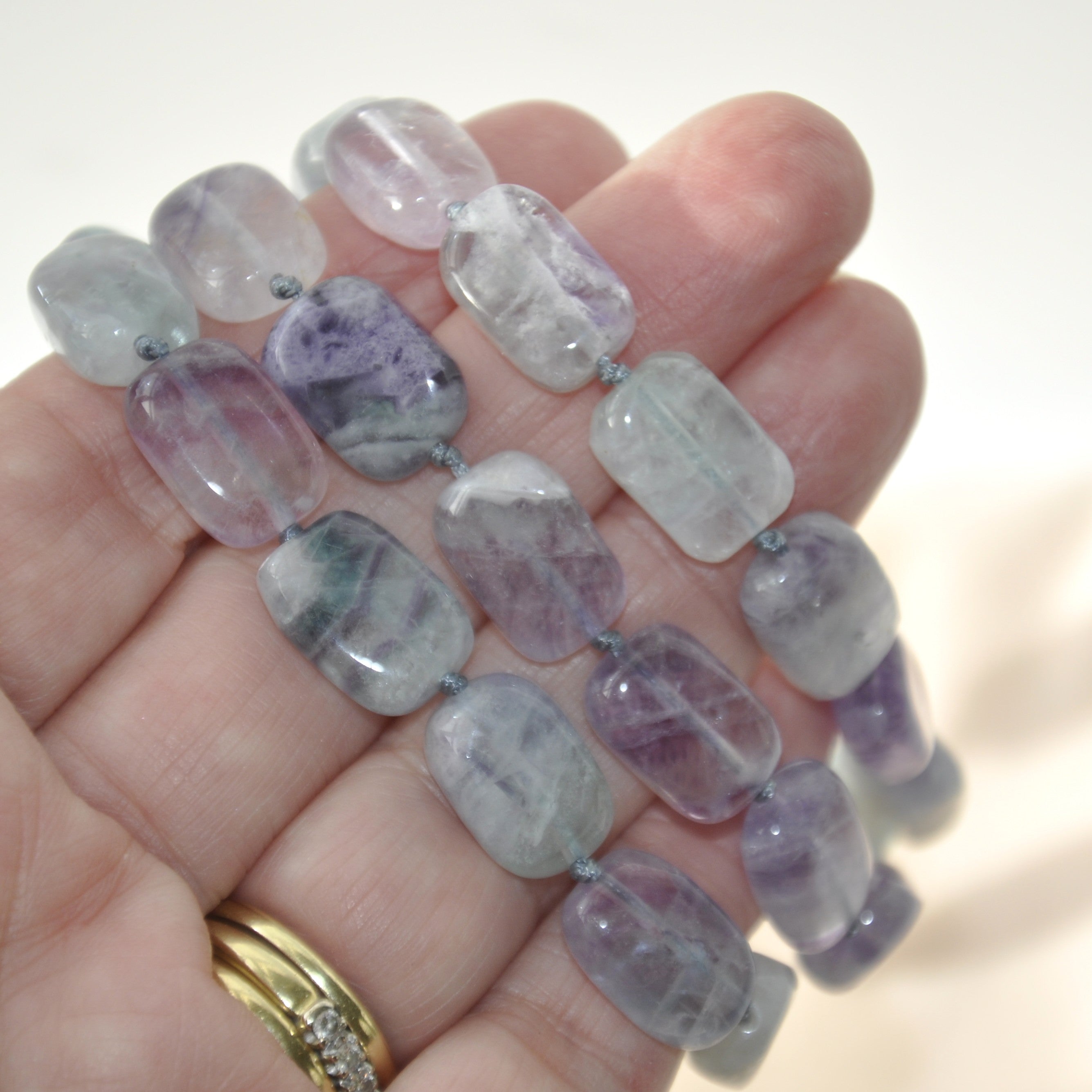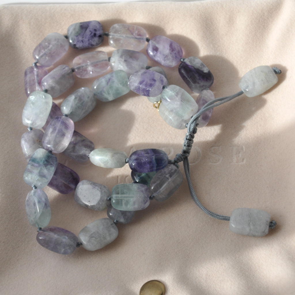 Absolutely lovely and rare triple stranded bracelet from Lola Rose. Polished rectangular beads of Rainbow Fluorite in varied hues of purple, green, grey and white make the loveliest combination.