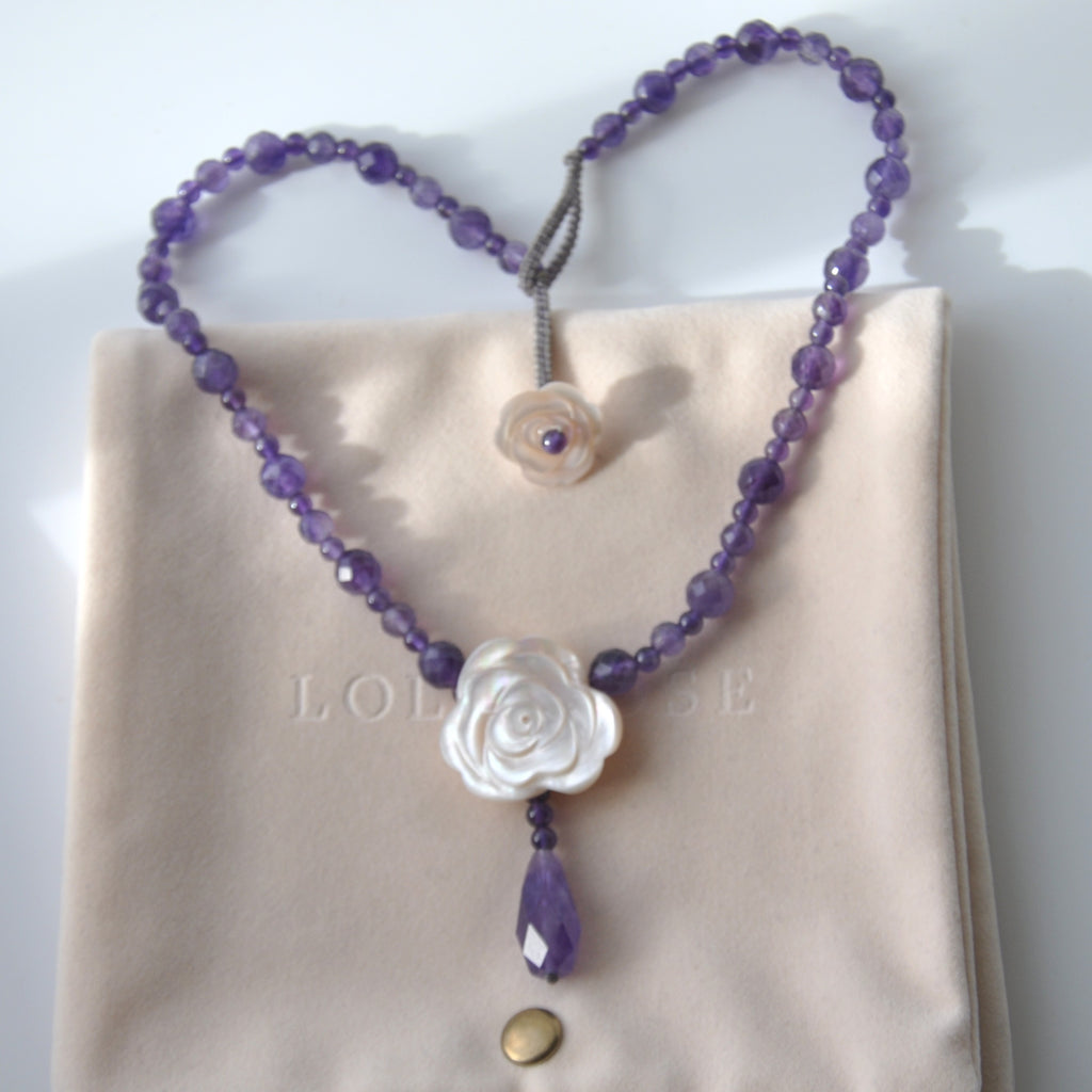 LOLA ROSE *rare* Amethyst Gemstone Mother of Pearl Flower Pendant Necklace