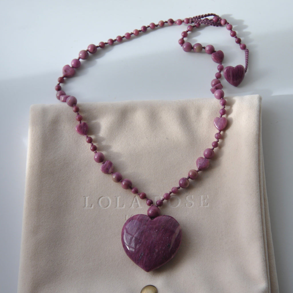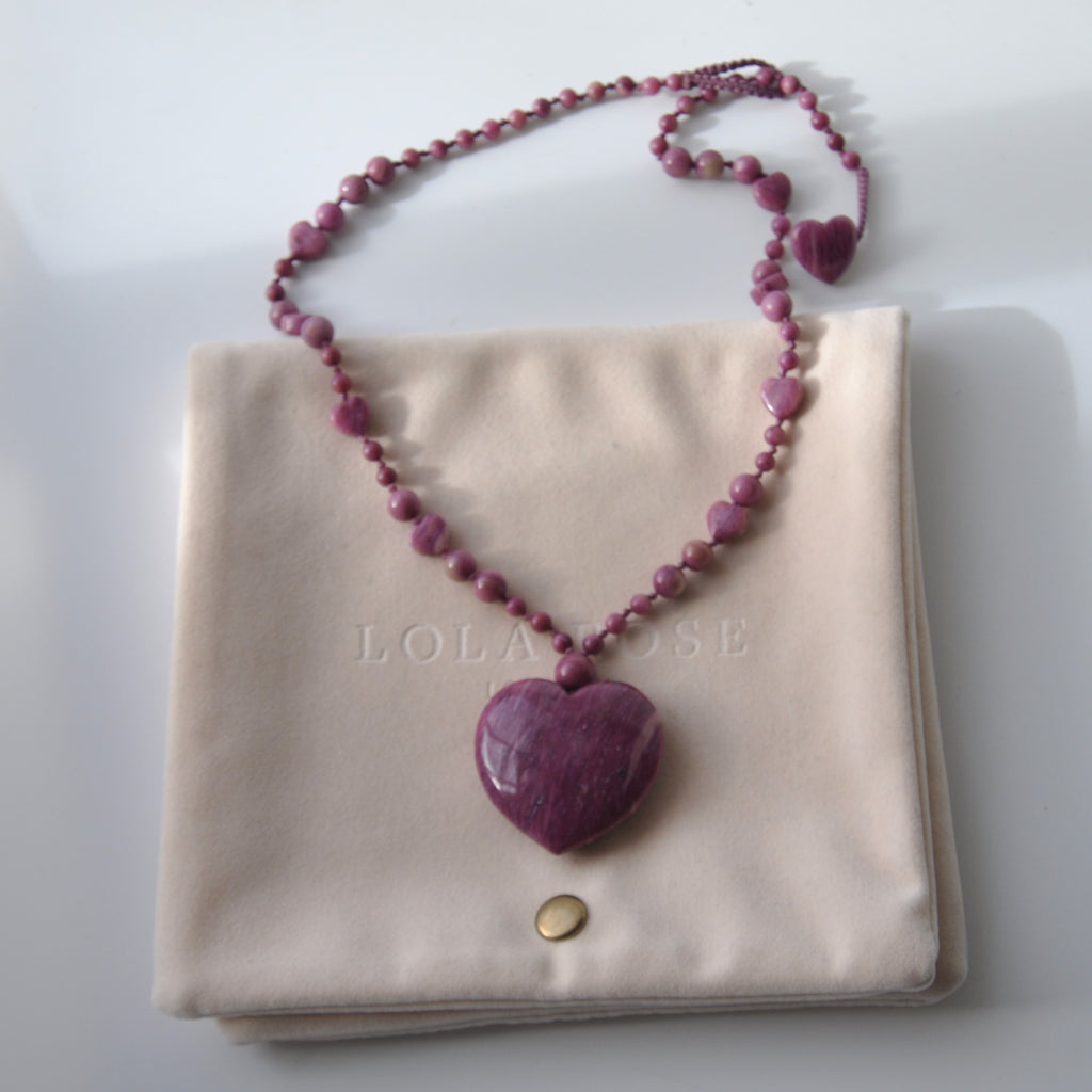 Beautiful pink rhodonite polished heart gemstone pendant. Heart shaped button closure.