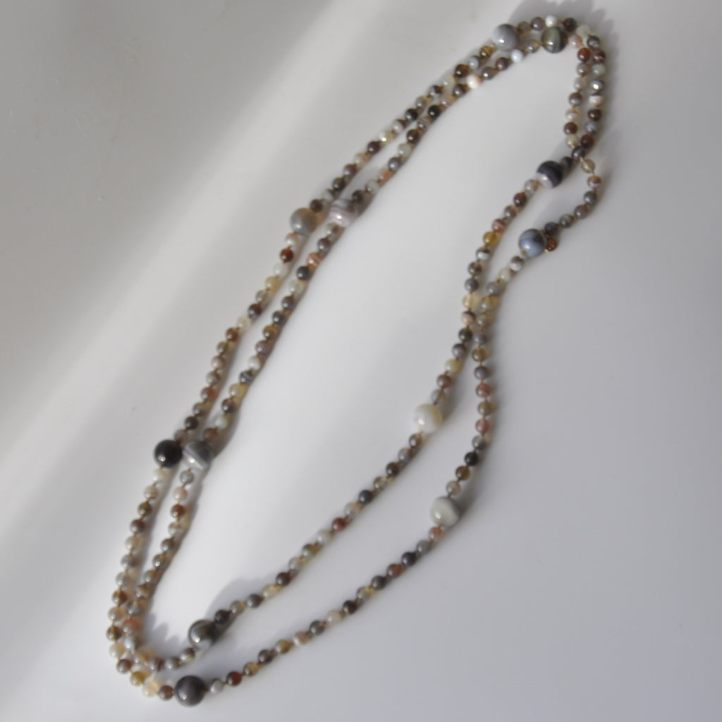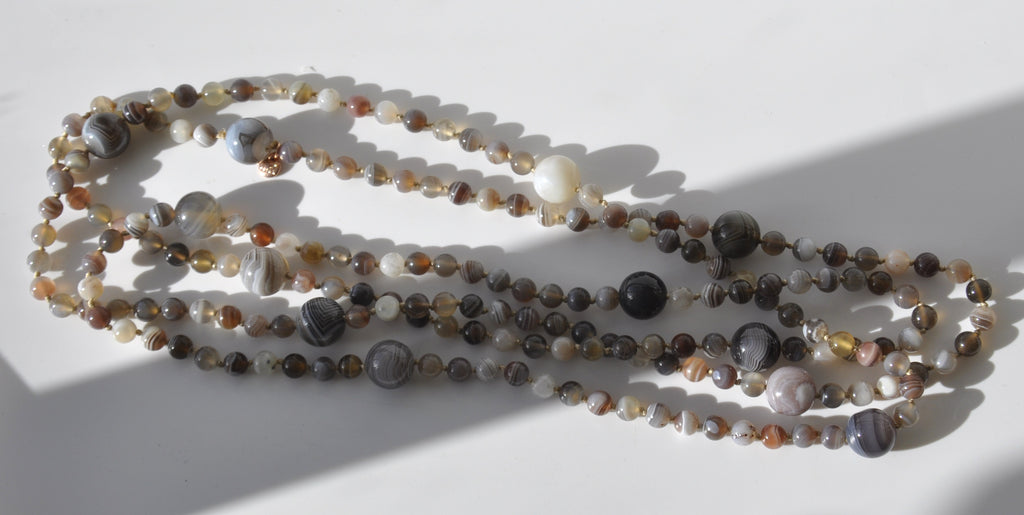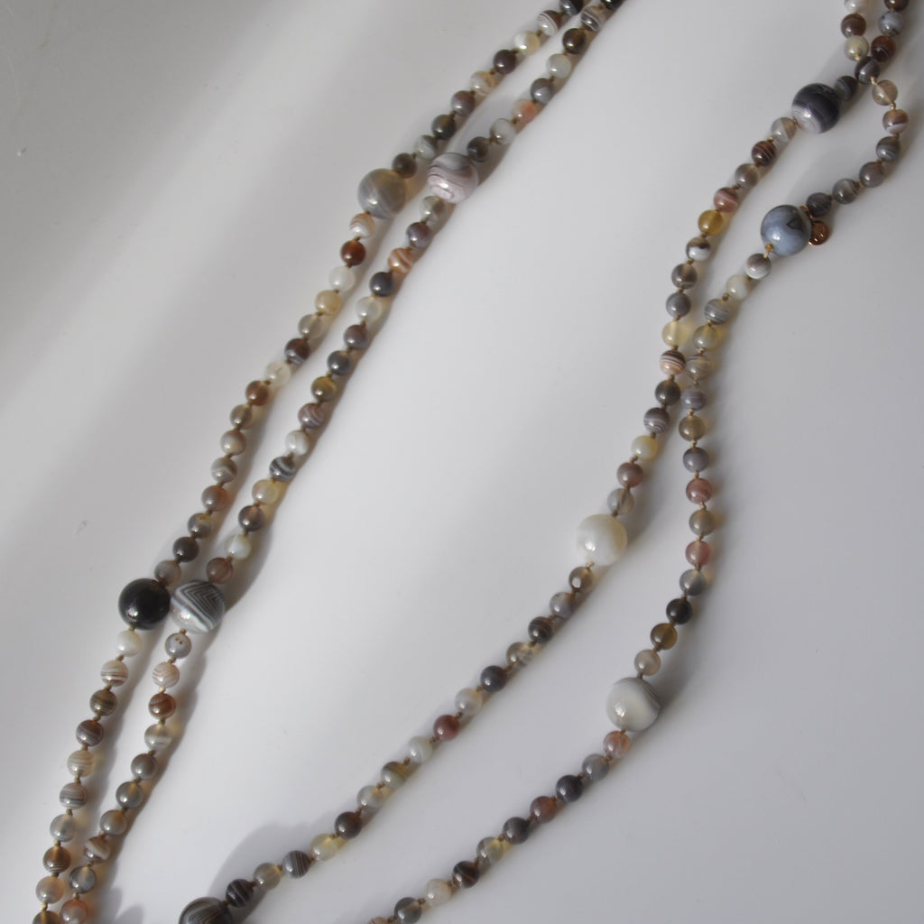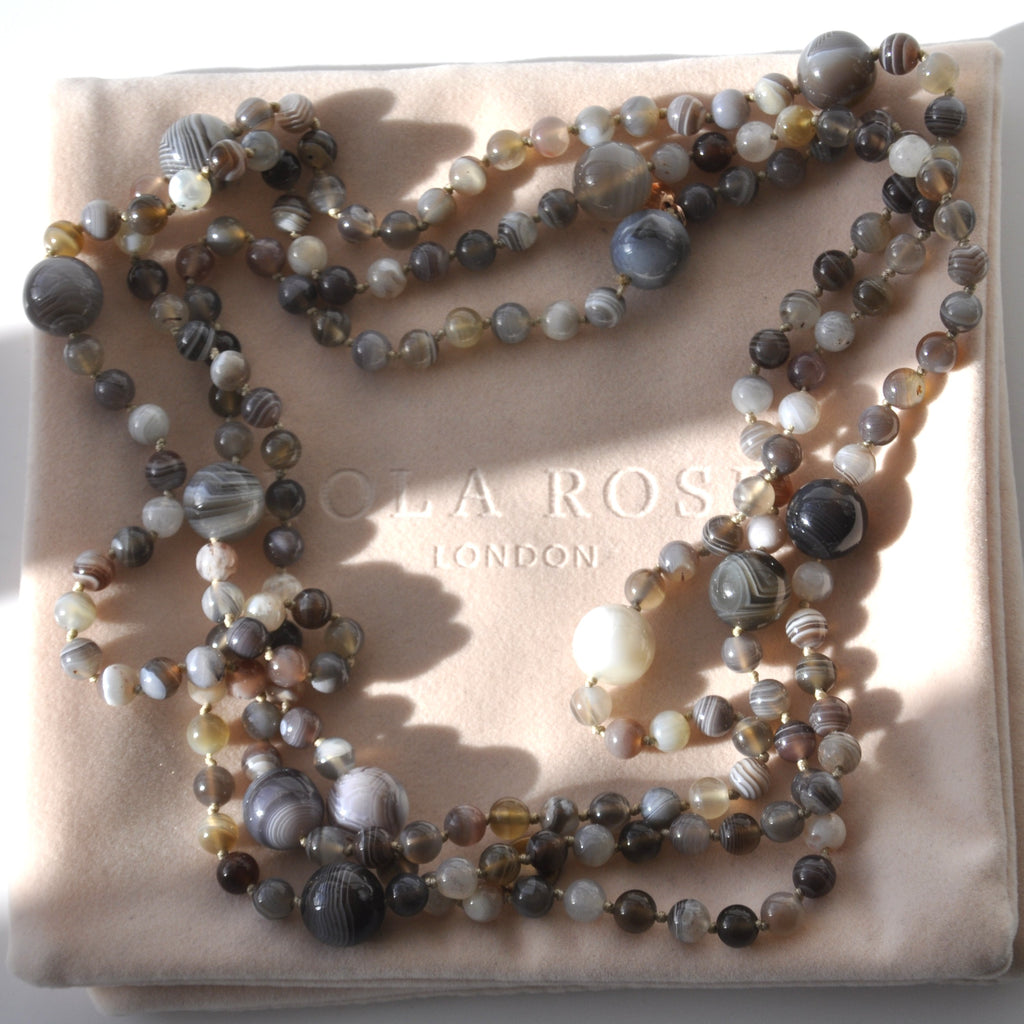 Absolutely beautiful multi-toned brown/white Botswana Agate necklace. Long length - 58 inches/145 cms - but can be worn doubled or tripled up to make a stunning piece. Lovely quality round beaded stones with 12 larger round feature beads. Gold Lola Rose branded tag.