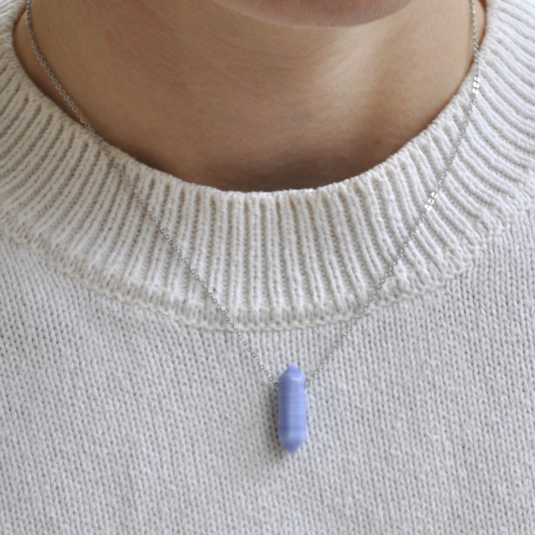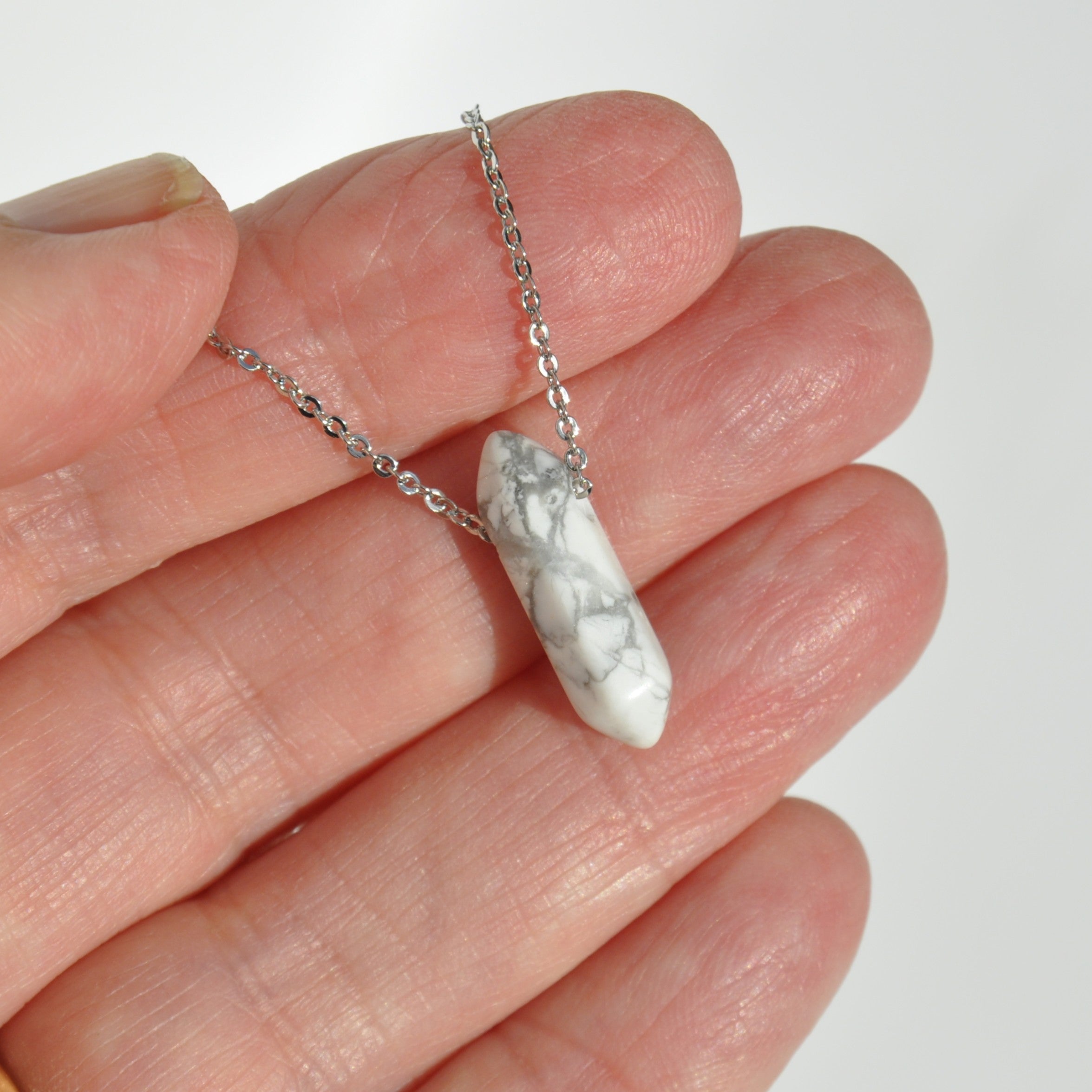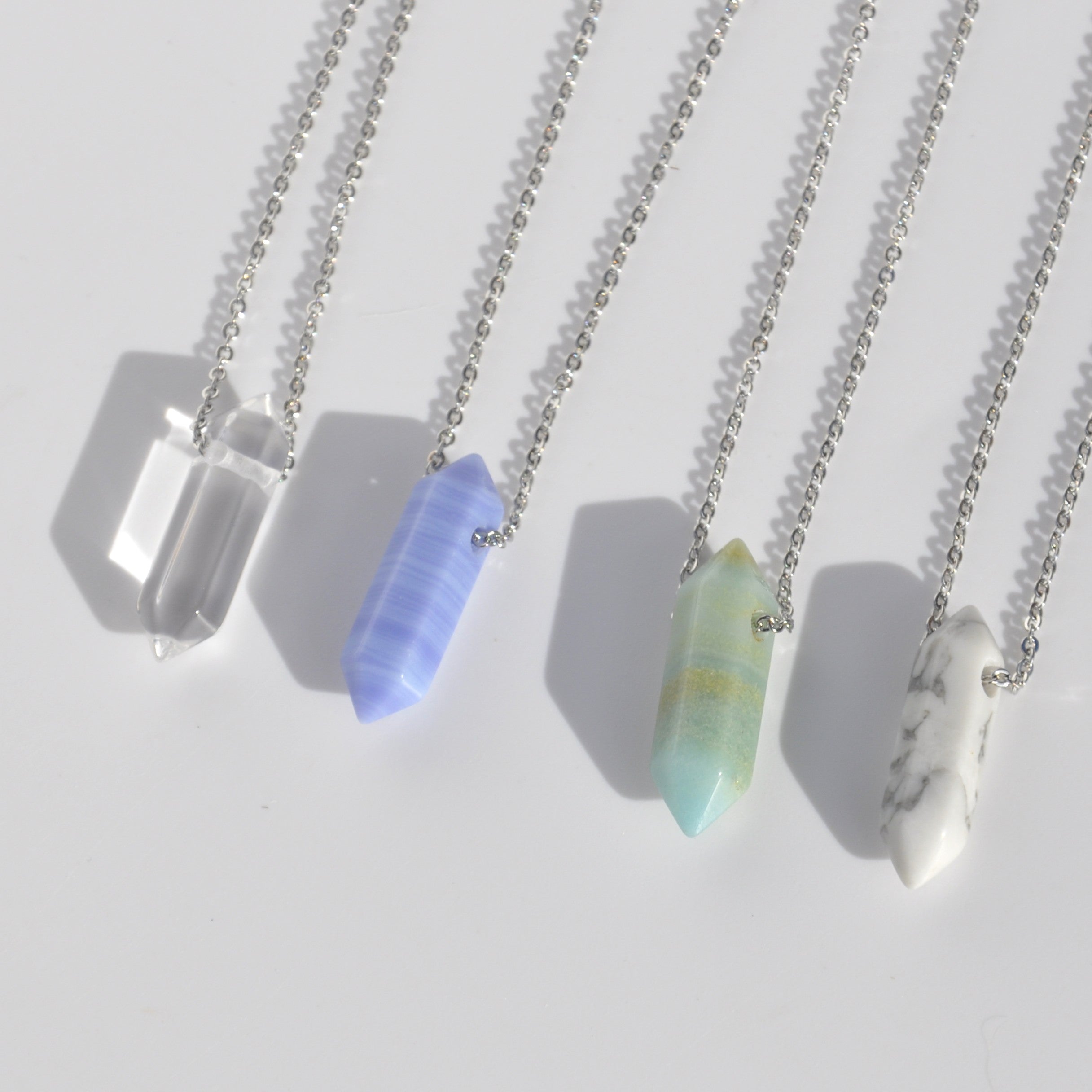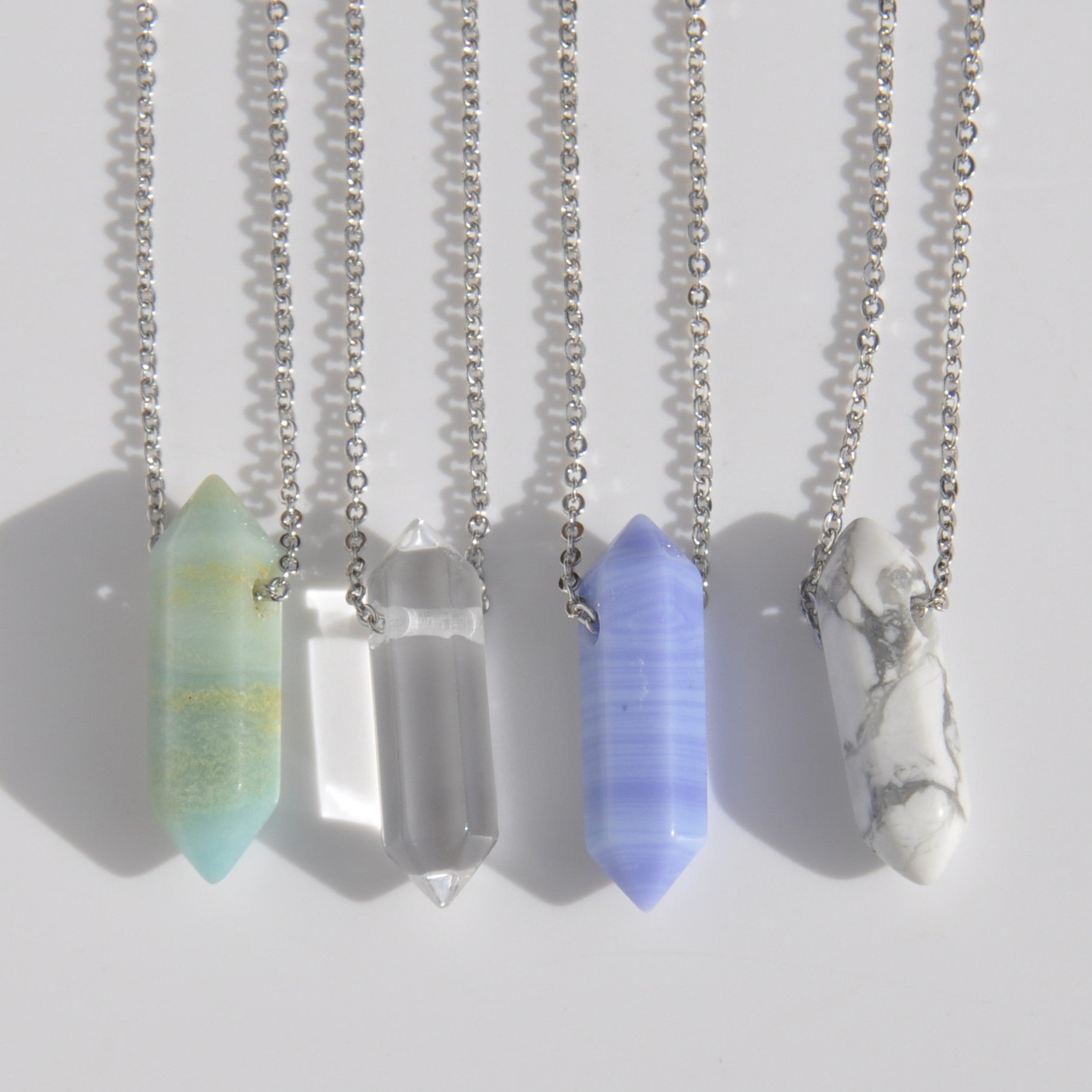 The crystal point measures 2cm long by 0.5 cm wide. It is threaded on a dainty silver-plated trace chain and is available in a choice of 5 crystals.