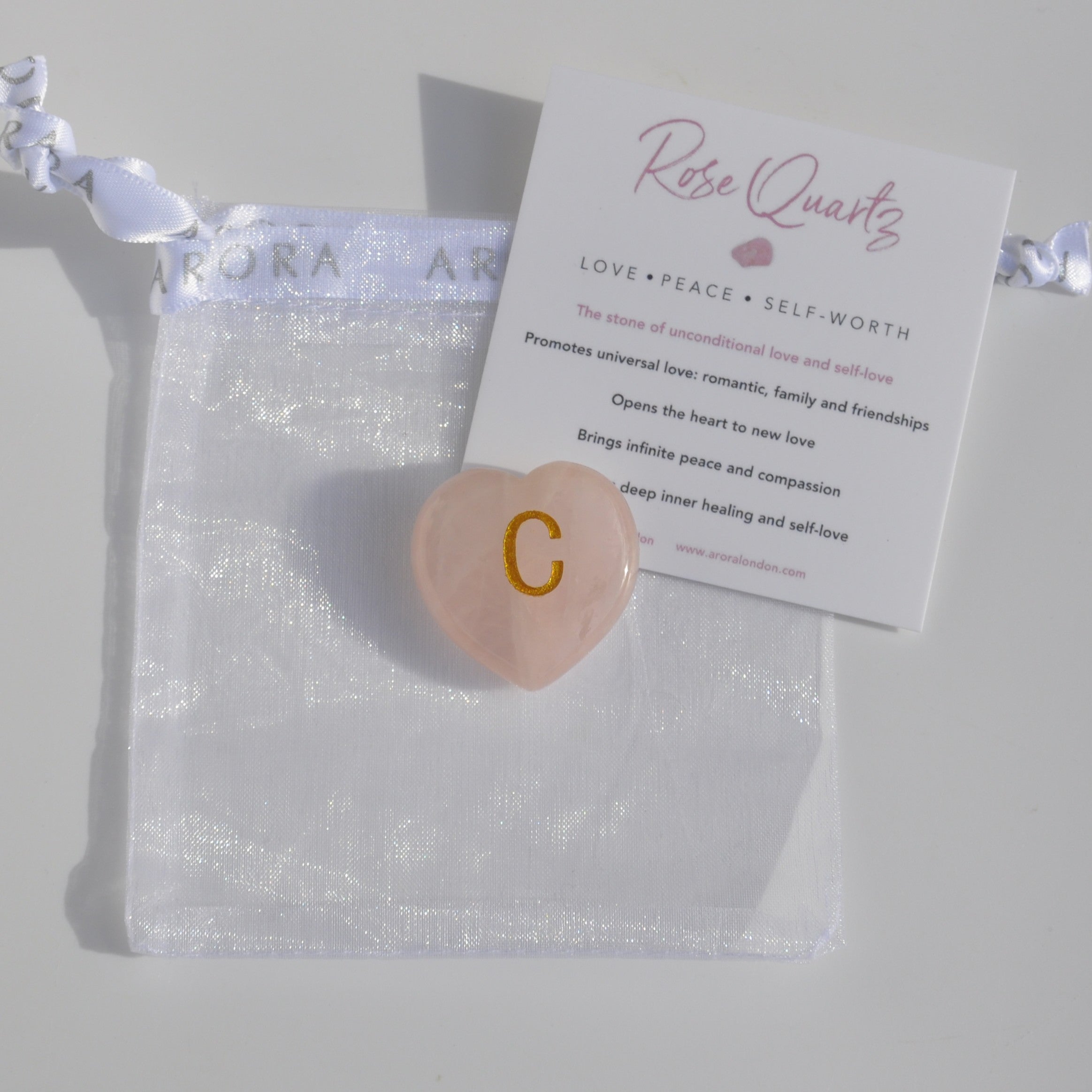 A unique gift idea for that special person - a beautiful Rose Quartz polished heart shape crystal, engraved in gold with their initial letter. Available in each of the 26 letters of the alphabet.