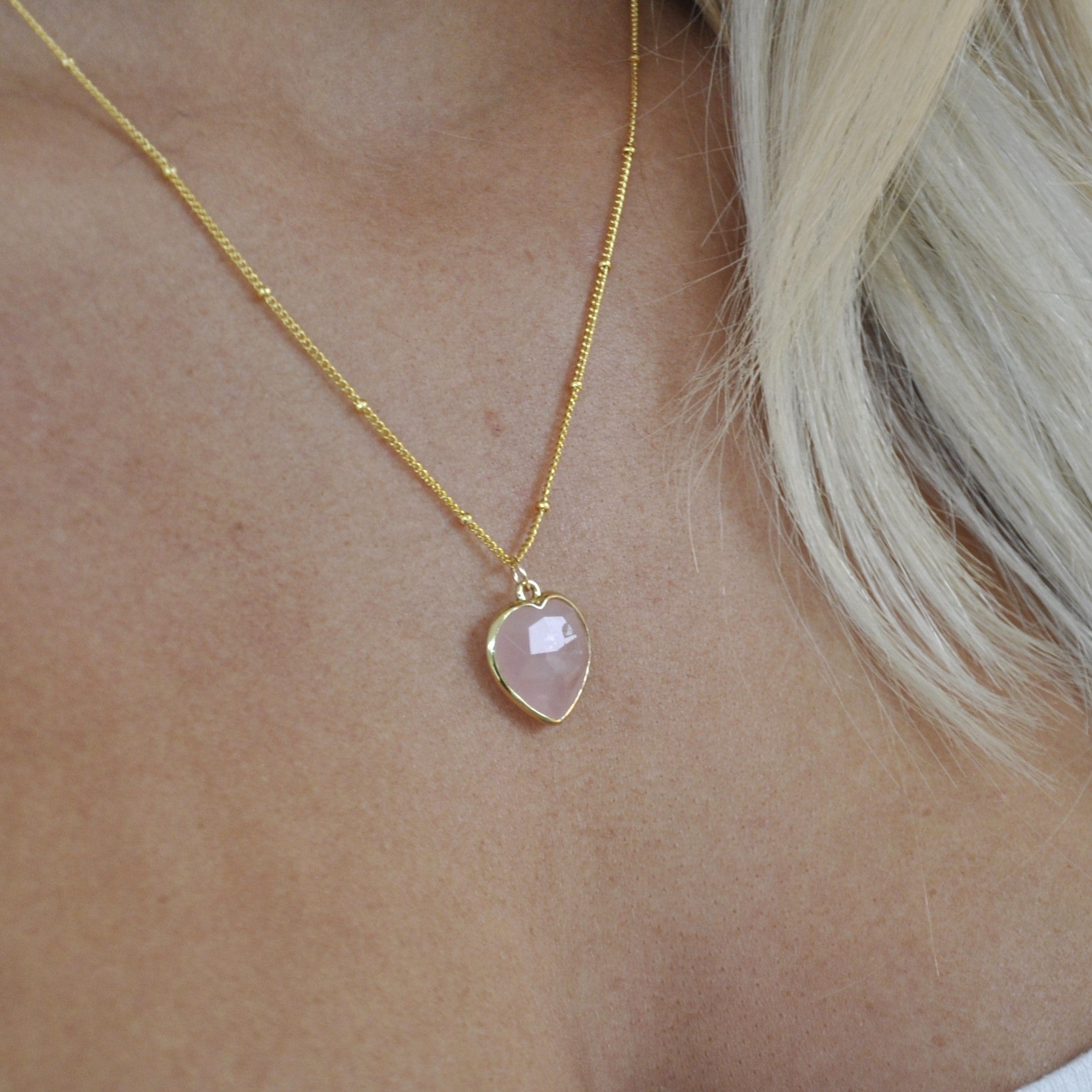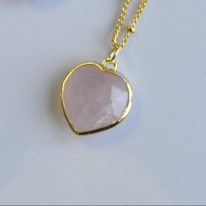 Adorable stylish crystal necklace featuring a Rose Quartz heart shaped gemstone pendant.